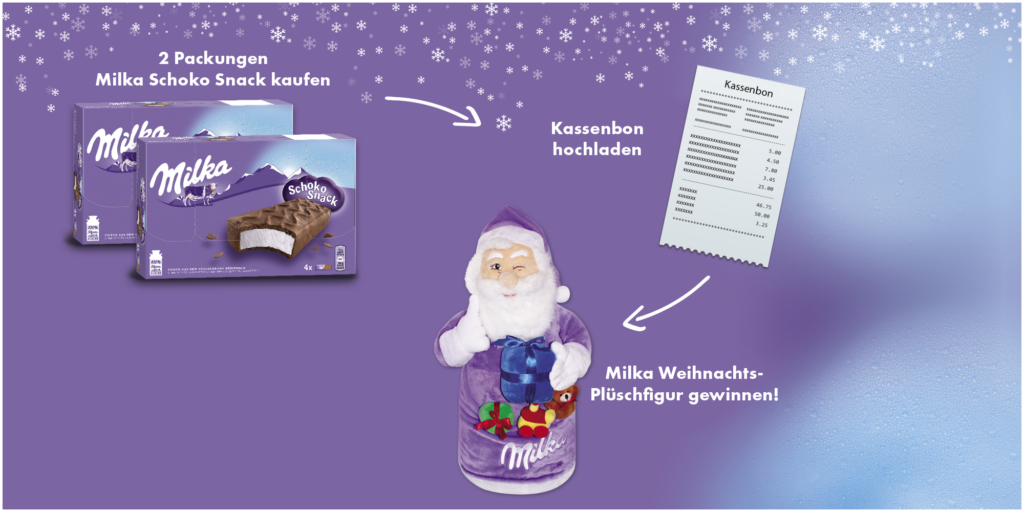 Genießt einen Milka Schoko Snack direkt aus dem Kühlregal, ladet die Rechnung von eurem Kauf von zwei Multipacks Milka Schoko Snack im untenstehenden Formular hoch und vielleicht steht schon bald eine Milka Weihnachts-Plüschfigur (3 verschiedene Designs) vor deiner Tür. 🎅